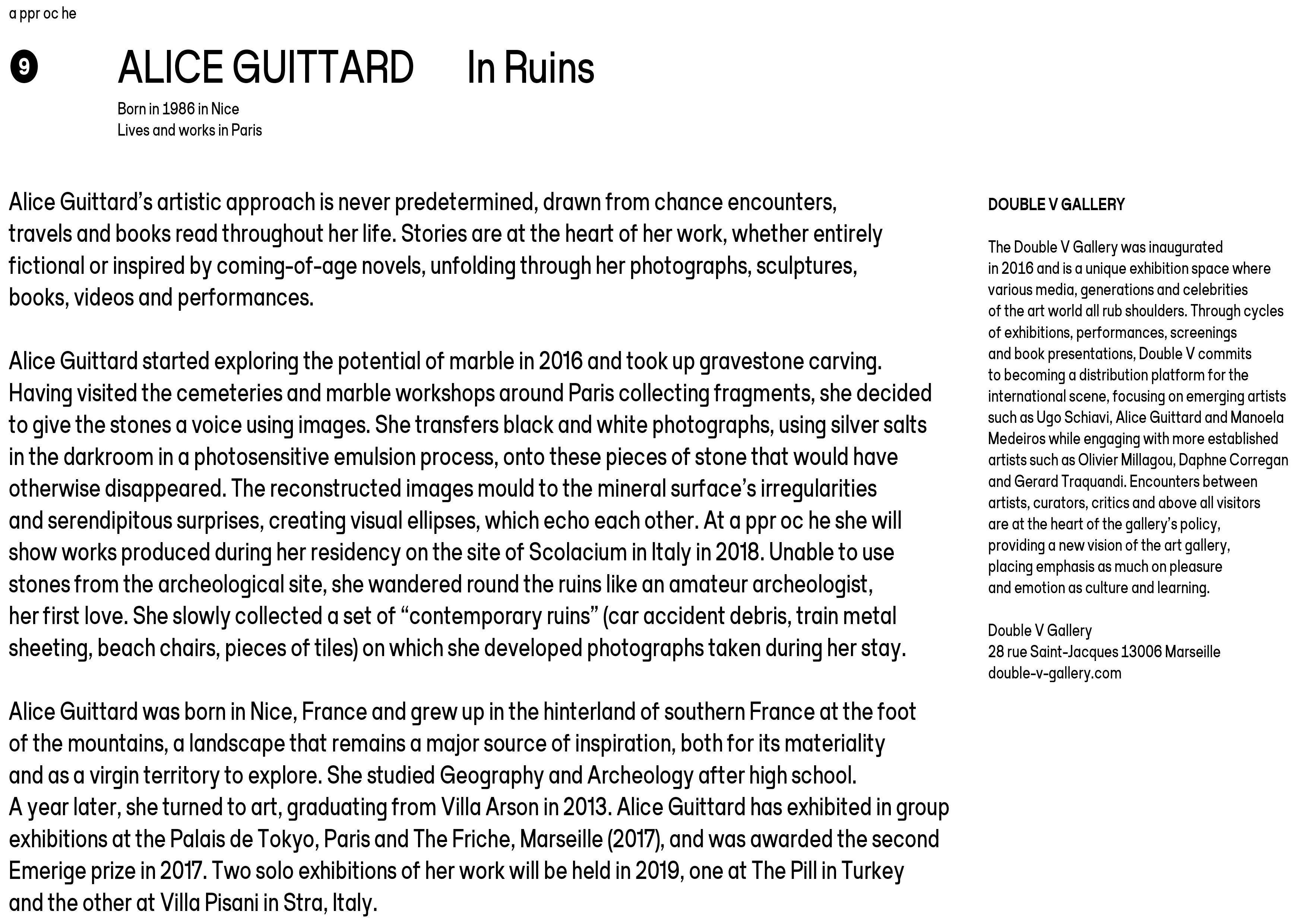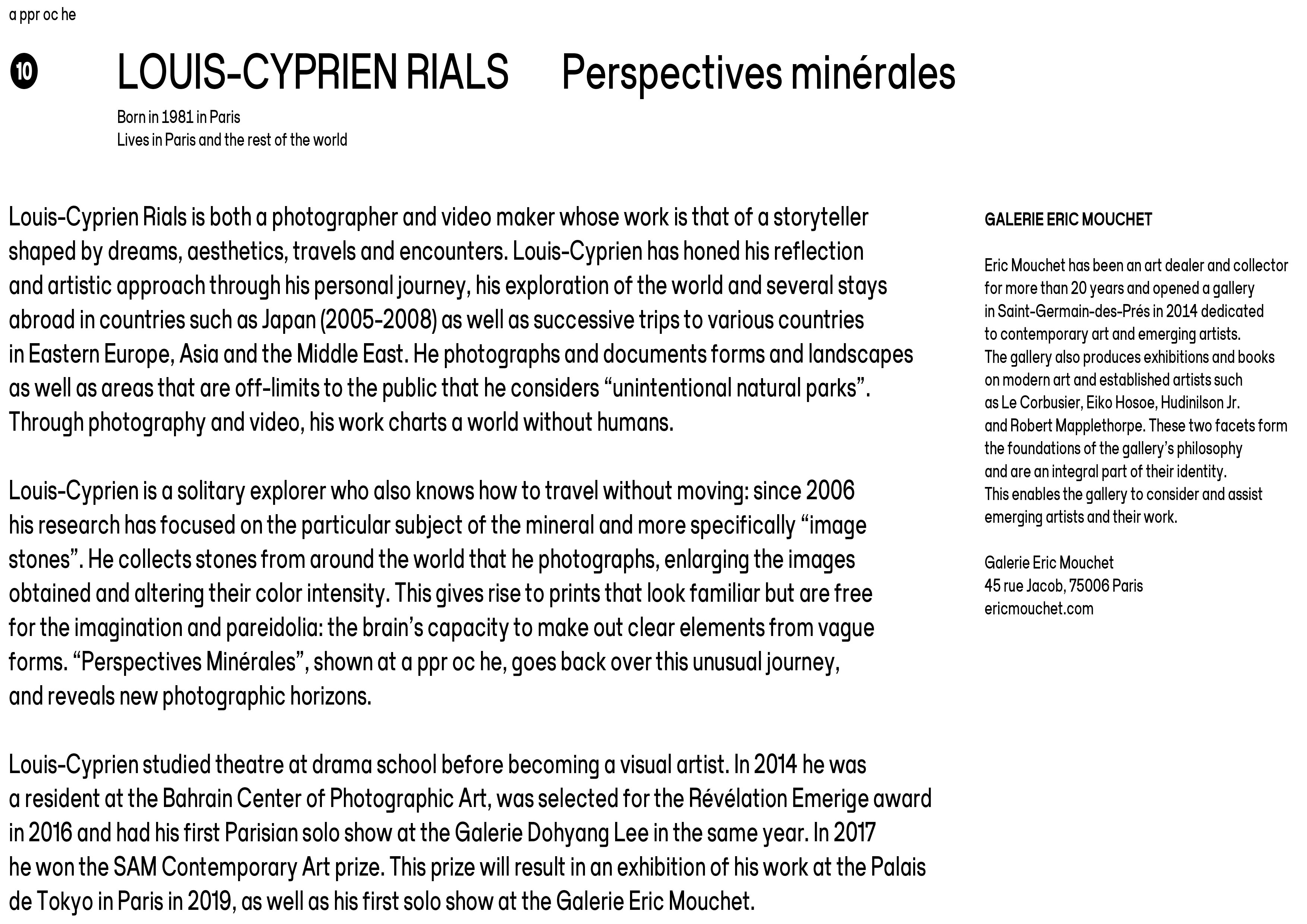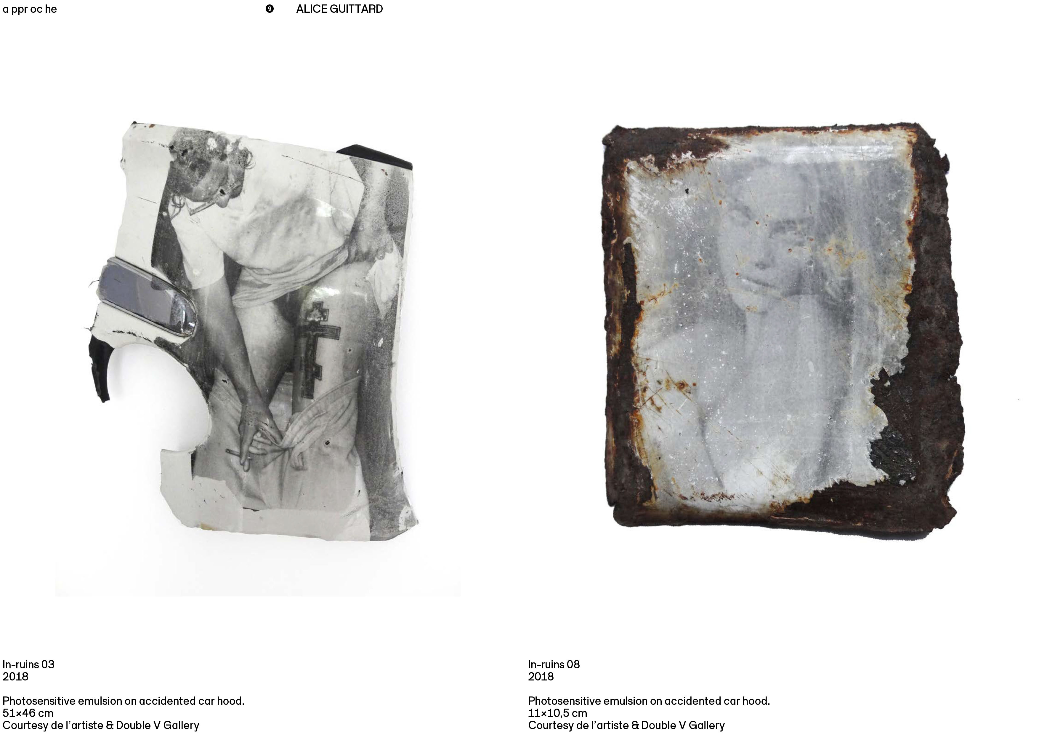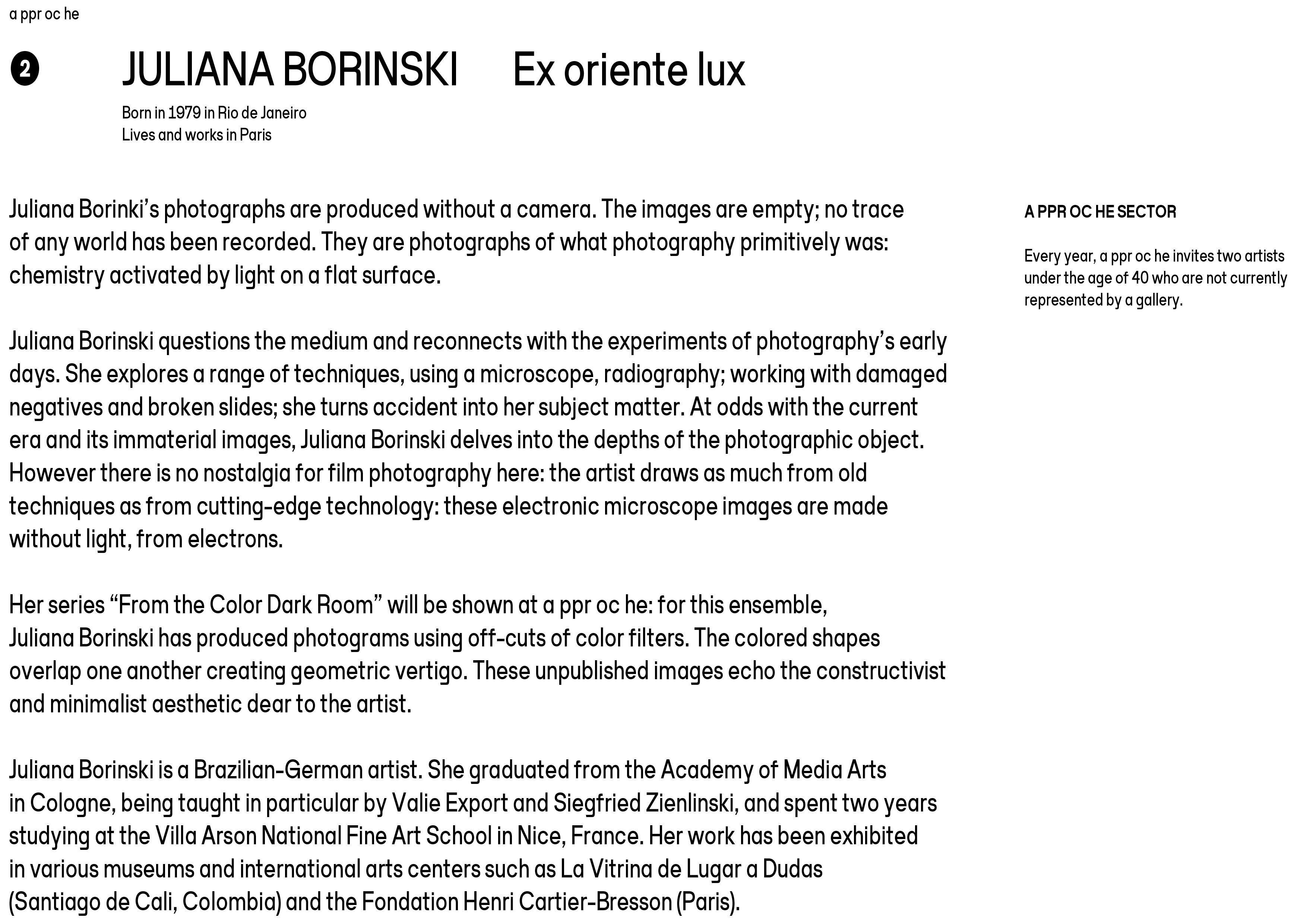 a ppr oc he selects artists who use photography on non-traditional media exploring issues of photosensitivity. The first edition was held in November 2017 at the Molière, a private mansion in the heart