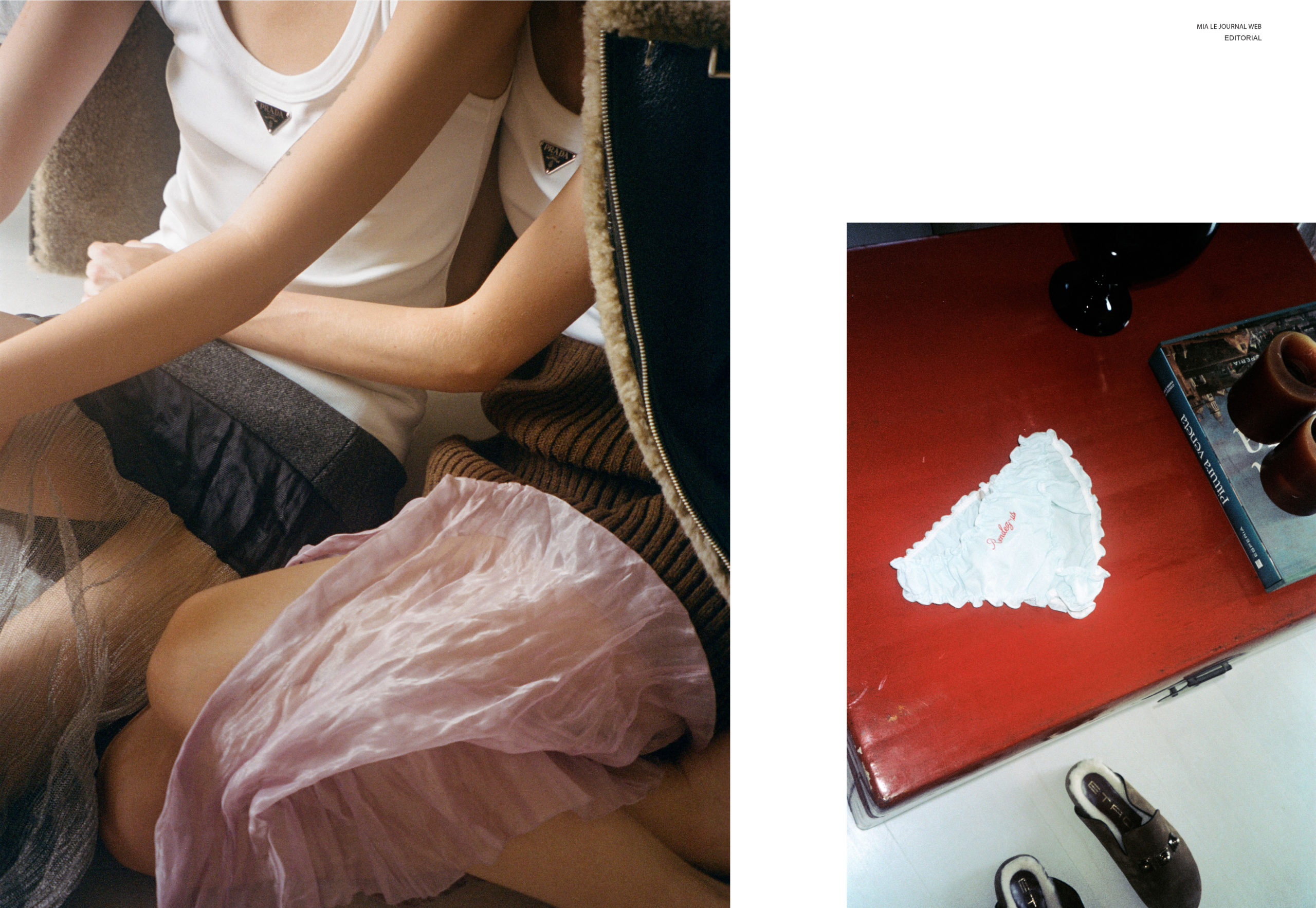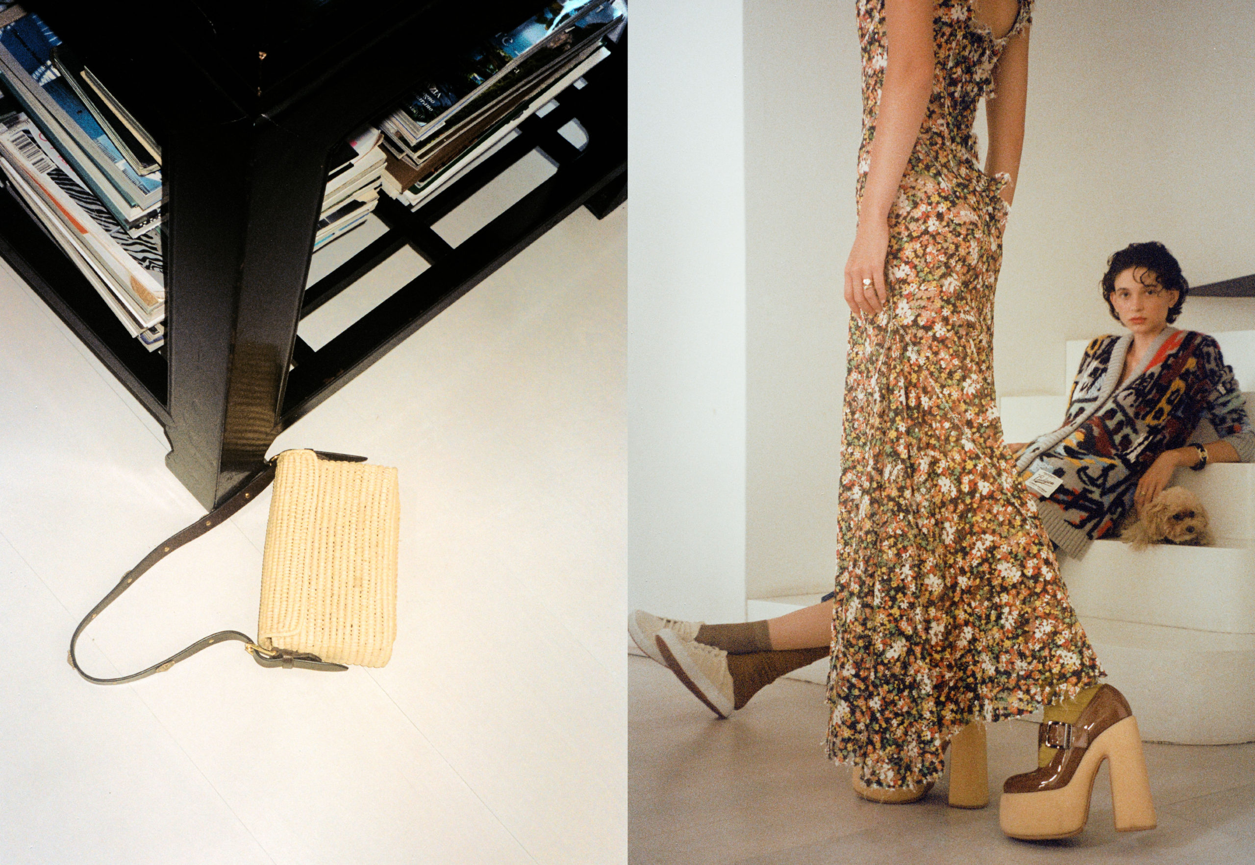left – SITONG wears dress and cardigan LORENA ANTOGNAZZI, socks MARIA LA ROSA, clogs BOTTEGATRE, SWEIA wears jumper and trousers ALBERTA FERRETTI, bracelet CHANEL.