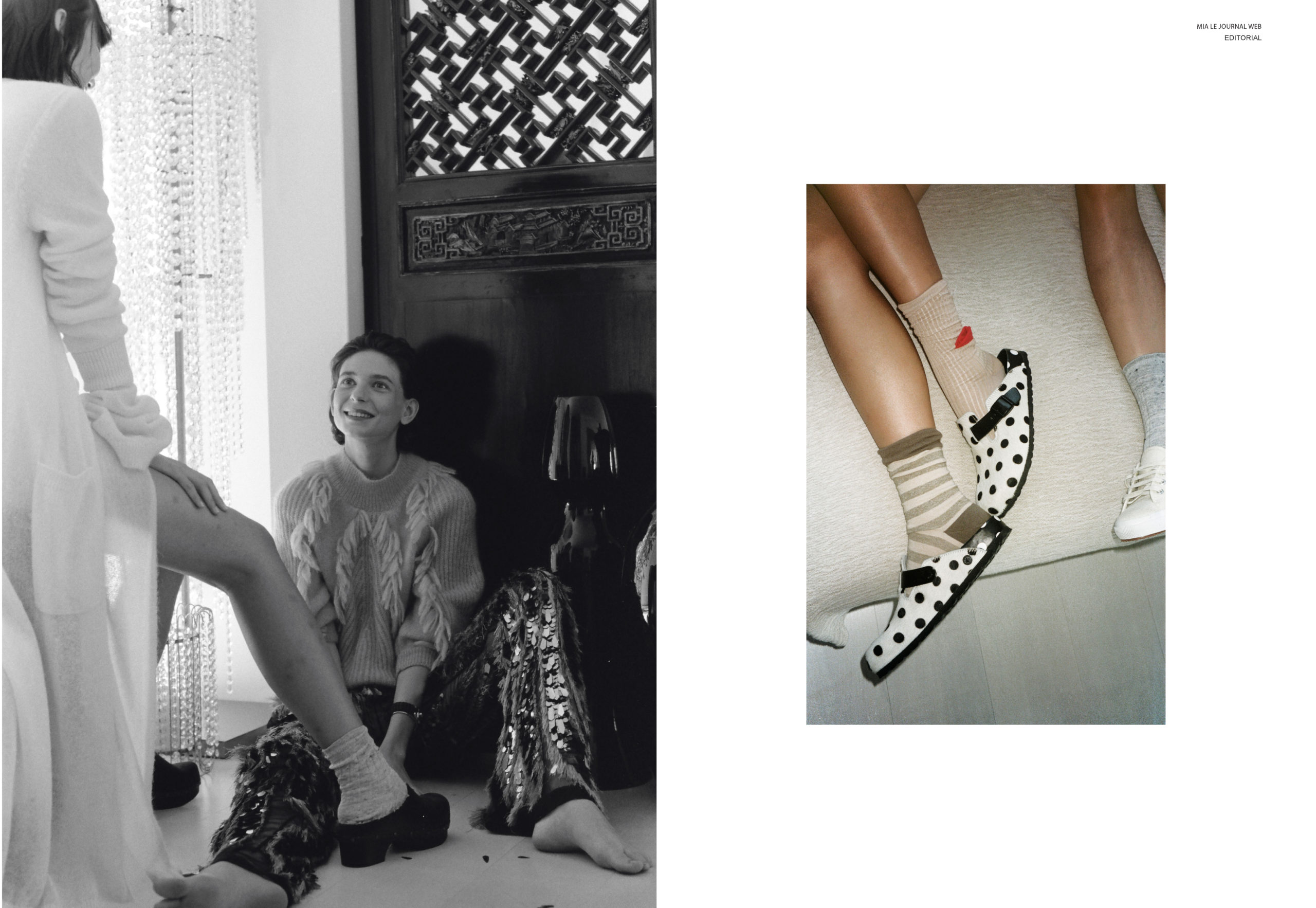 right – SITONG wears dress MARNI, rings RUE DES MILLE, green sock FALKE, shoes CASADEI, SWEIA wears cardigan MISSONI, skirt JACOB COHEN, bracelet CHANEL, short sock MARIA LA ROSA, long sock FALKE, shoes SUPERGA
