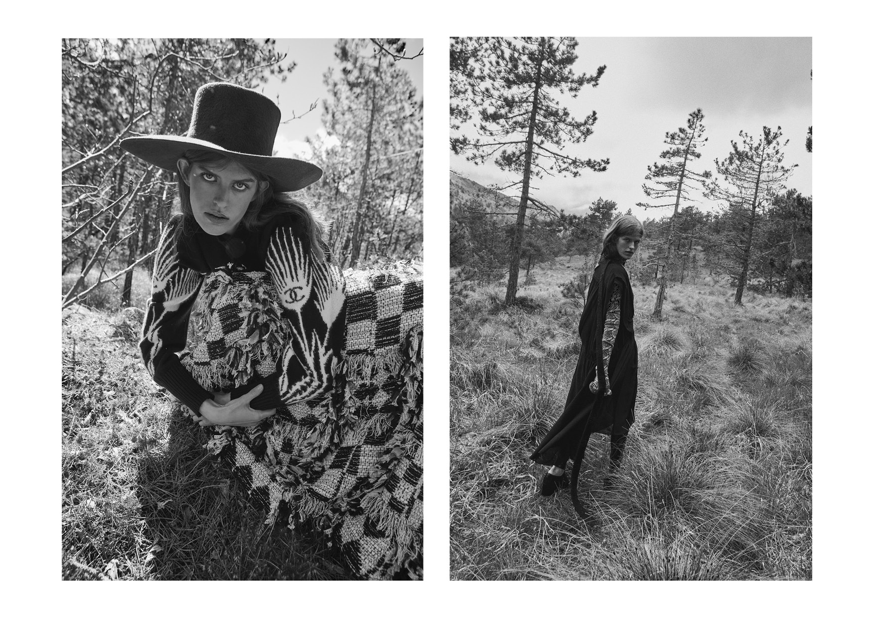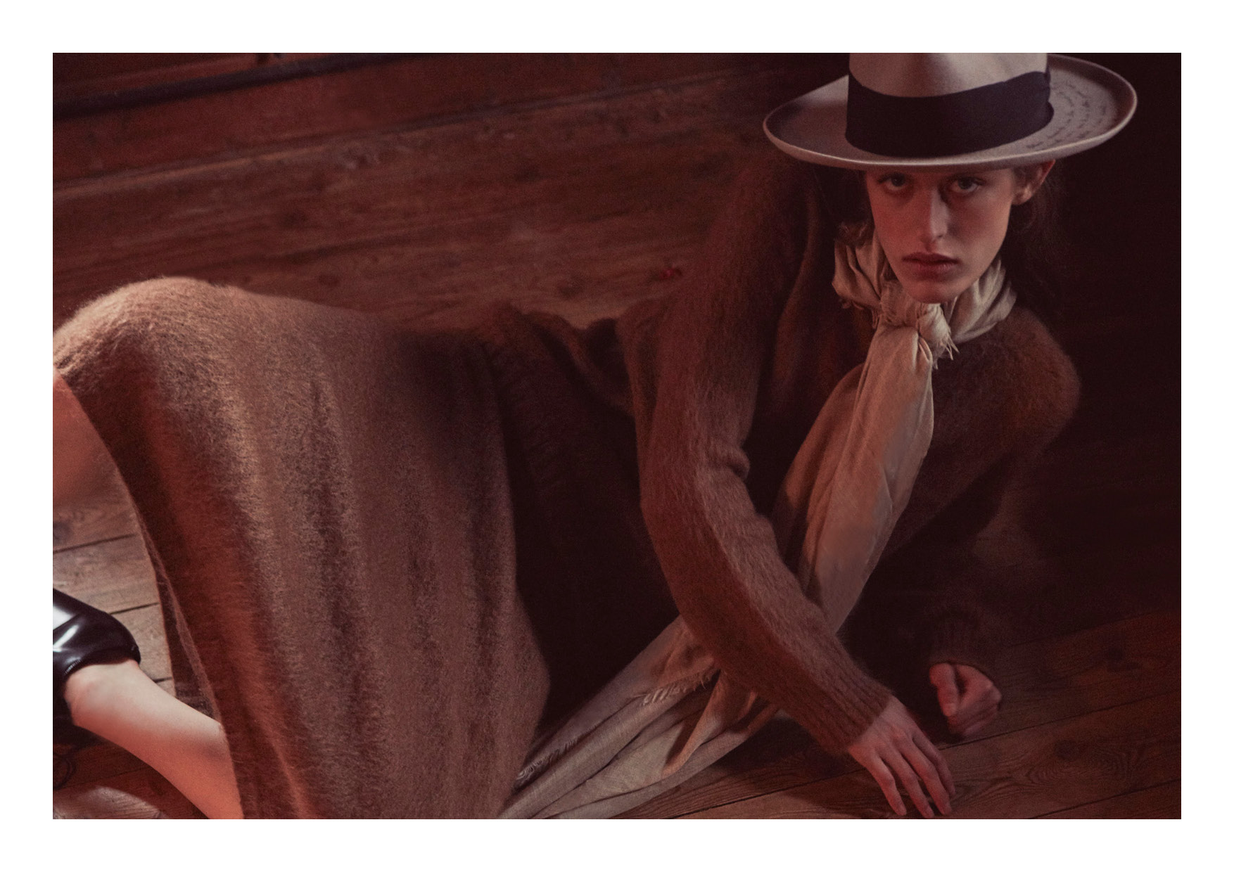 Left page – Knitwear and maxi skirt Chanel, hat Alberta Ferretti