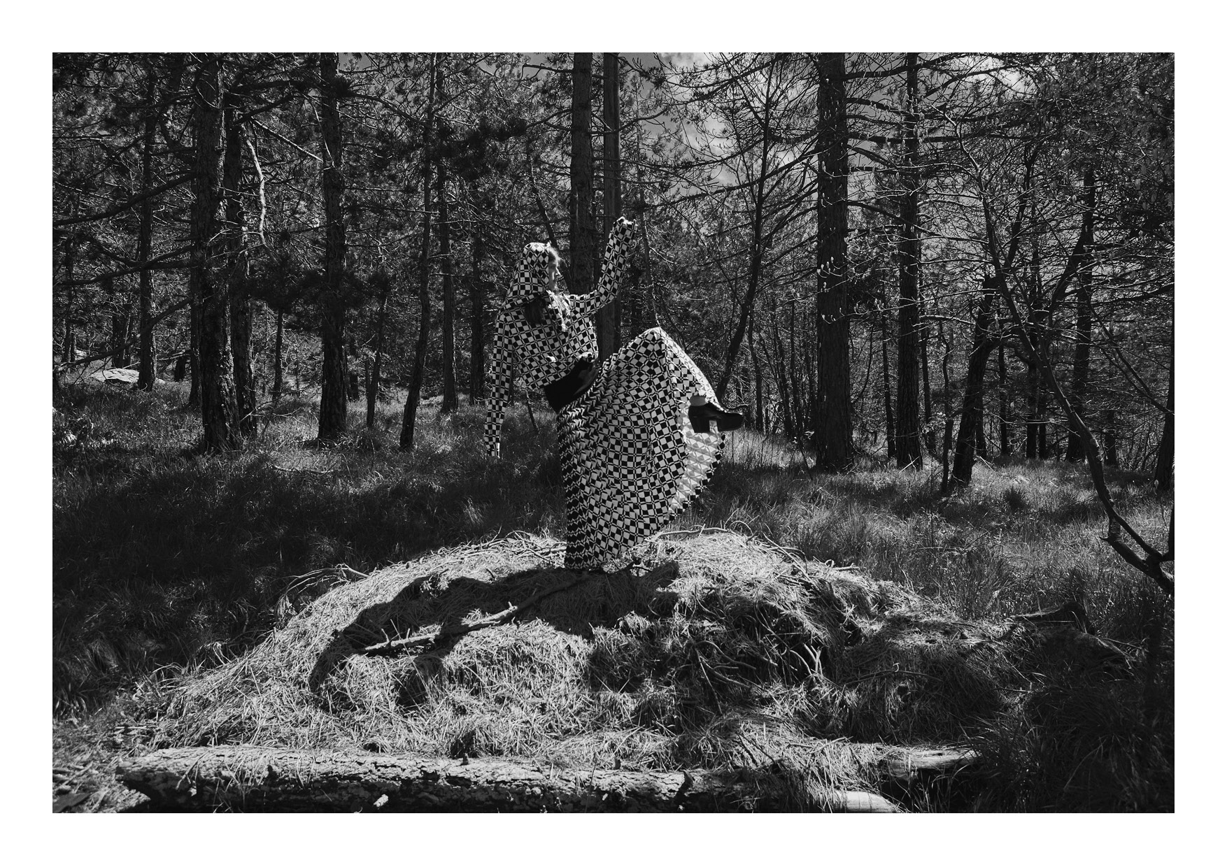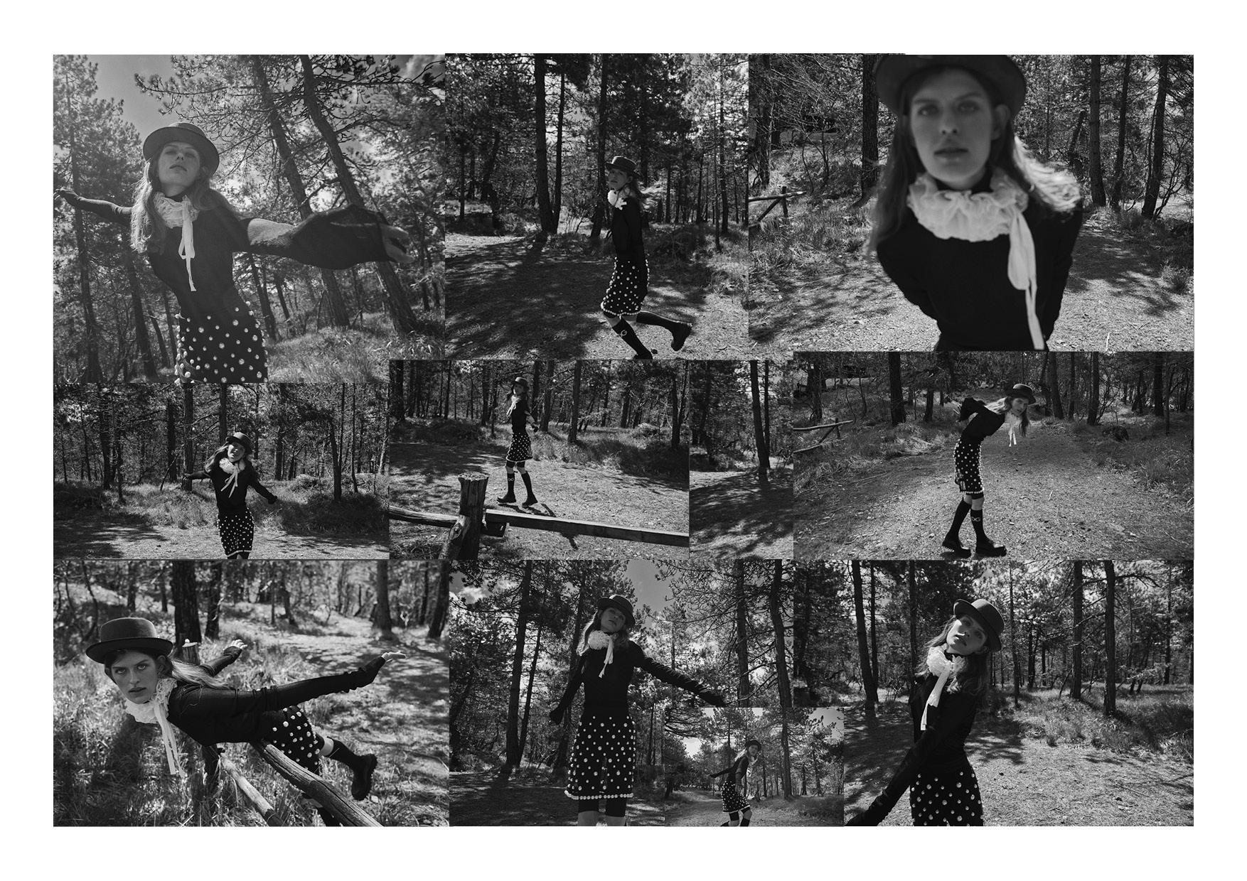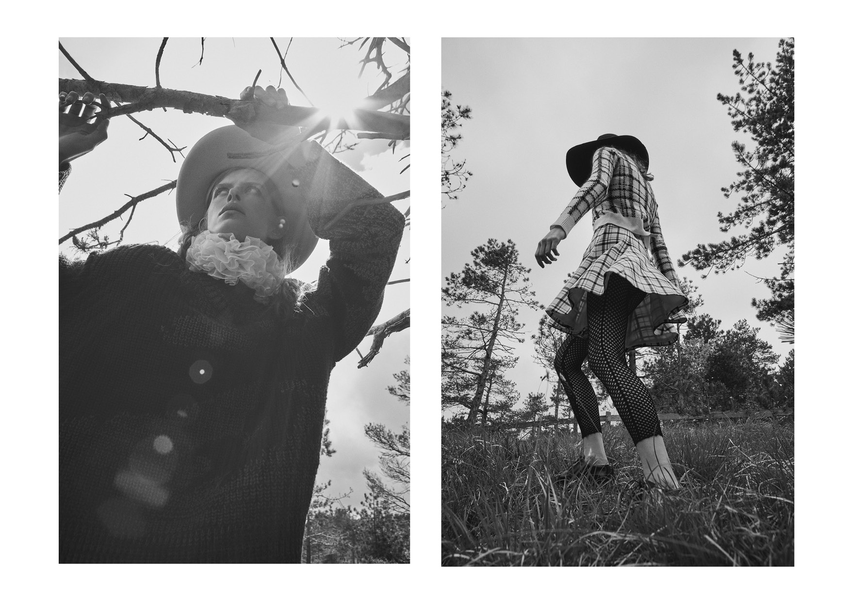 Right page – Shirt, dress, cardigan and leggings Dior, hat Montegallo, shoes Prada