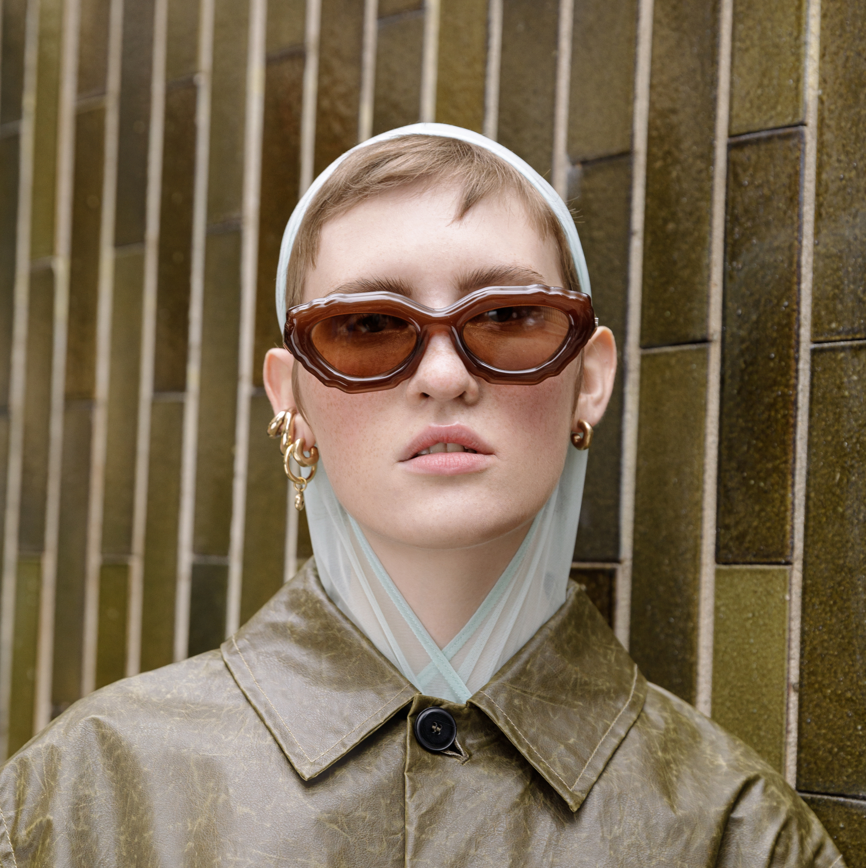 right – Coat POMANDÈRE, hooded bodysuit EXILIA, sunglasses JUNK, earrings ÈSILE.