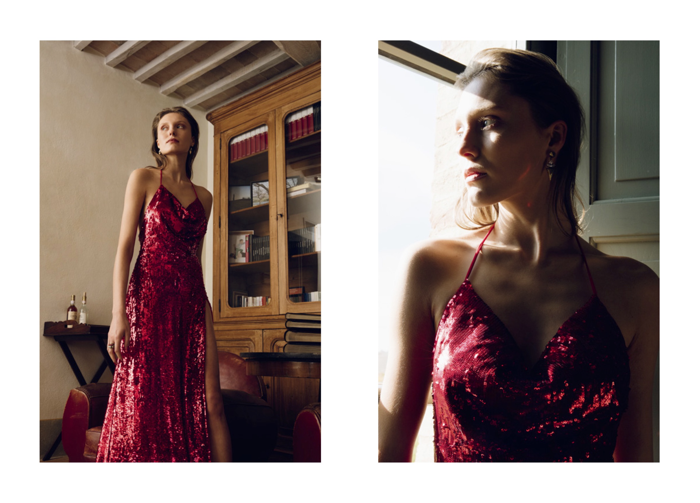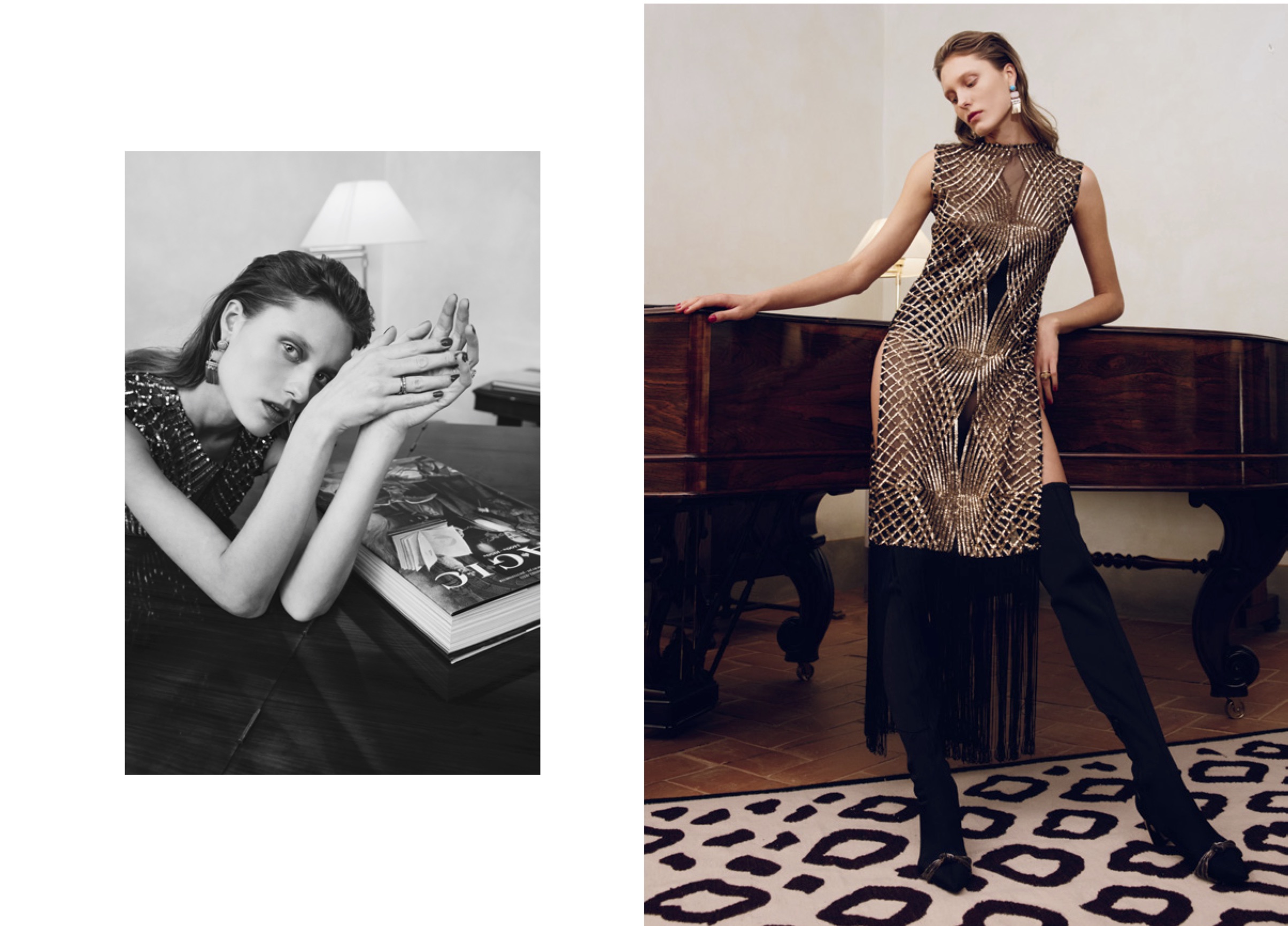 La designer romana riparte da zero, ha raggiunto una nuova maturità di linguaggio e di forma espressiva, che si dichiara in una sofisticata semplicità senza tempo. Uno chic immediato, apparentemente facile, easy to-wear e versatile. “Sono partita proprio da questo momento di generale oscurità del nostro mondo- racconta Ludovica-, sentivo il bisogno di energia, di un’allegria di colore e di mood. Credo la provino in tanti oggi, questa voglia di evadere, di giocare e sognare, questa necessità di guardare oltre. La mia è una riflessione sulla leggerezza significante dell’abito, che diventa un qualcosa di effimero ma che è anche essenziale, di elegante ma con un senso di humour e di puro divertissement. Tutto è nato per caso a Ibiza, un luogo che davvero mi appartiene e che mi ha sempre regalato ispirazioni e idee. La chiave me l’ha data un attimo straordinario di natura, che si è trasformato in suggestione estetica e in seguito in fashion. Durante una passeggiata, sono rimasta incantata dalla perfezione di due alberi vicini, un fico e un limone, in cui mi sono imbattuta. Il fogliame diverso che si mescolava e che dialogava con il sole mi ha fatto riflettere su come da sempre il mio desiderio fosse quello di integrare la conoscenza antica con qualcosa da potere riportare in vita. A volte- sottolinea Ludovica Amati- , le cose più profonde passano attraverso casualità e circostanze inattese.” La natura, nella Nocturne Collection di Ludovica Amati, diventa coolness metropolitana, con un brivido vagamente ’80 da Studio 54, fragranze tropicali resort che si miscelano a una linearità spiccata, fluida e sensuale. Ci sono pjyama -anche in versione sexy short- , fourreau sinuosi e disegnati sul corpo, mini gonne a portafoglio bias cut. Per contrasto, ecco gli ampi caban in sfumature dégradé, realizzati in paillettes e micro-paillettes. La palette si articola su toni di rosa chiaro e più speziato, di scarlatto e cremisi, su una trama di blu e azzurri intensi fino all’oro, al bianco e al nero. Le camicie di gusto bon ton si reinventano con lamé traforati d’oro vecchio, trasparenze black brodé e stampe su seta a motivi di frutta tropicale e macro-animalier. Ananas e banane ricamati segnano gli abiti e le giacche sui punti nodali, introducendo un ritmo sensuale. E’ un omaggio a Yma Sumak, regina del mambo peruviana dall’incredibile estensione vocale. Un tributo a lei, ai suoi look formidabili e all’esotismo, andando fino alle origini ,ma con un approccio fun e quasi comic. I vari pezzi che compongono la collezione sono estremamente componibili, si ridefiniscono secondo codici e interpretazioni le più diverse e cangianti. Rispondo a molte e differenti possibilità. “Da qui, da queste atmosfere esotiche e musicali un po’ 50, ho cominciato la mia ricerca- aggiunge ancora Ludovica-. Ne è emersa la visione di una donna elegante, dall’allure declinata in maniera décontracté e soprattutto ironica. Broderies, su textures paillettate glitter, frivolezza un touch molto femminile che conserva un imprinting geometrico, su uno sfondo di rigore e astrazione. Nella contraddizione di termini sta tutta la modernità di questo lavoro, che si rivolge a donne di ogni tipo ed età. L’obiettivo che mi ero posta- conclude la designer- era di dare vita a un concetto di vestito che non costringe, che non limita e non fa troppo riflettere. Ma che possiede libertà e bellezza. Anzi, la bellezza della libertà.”