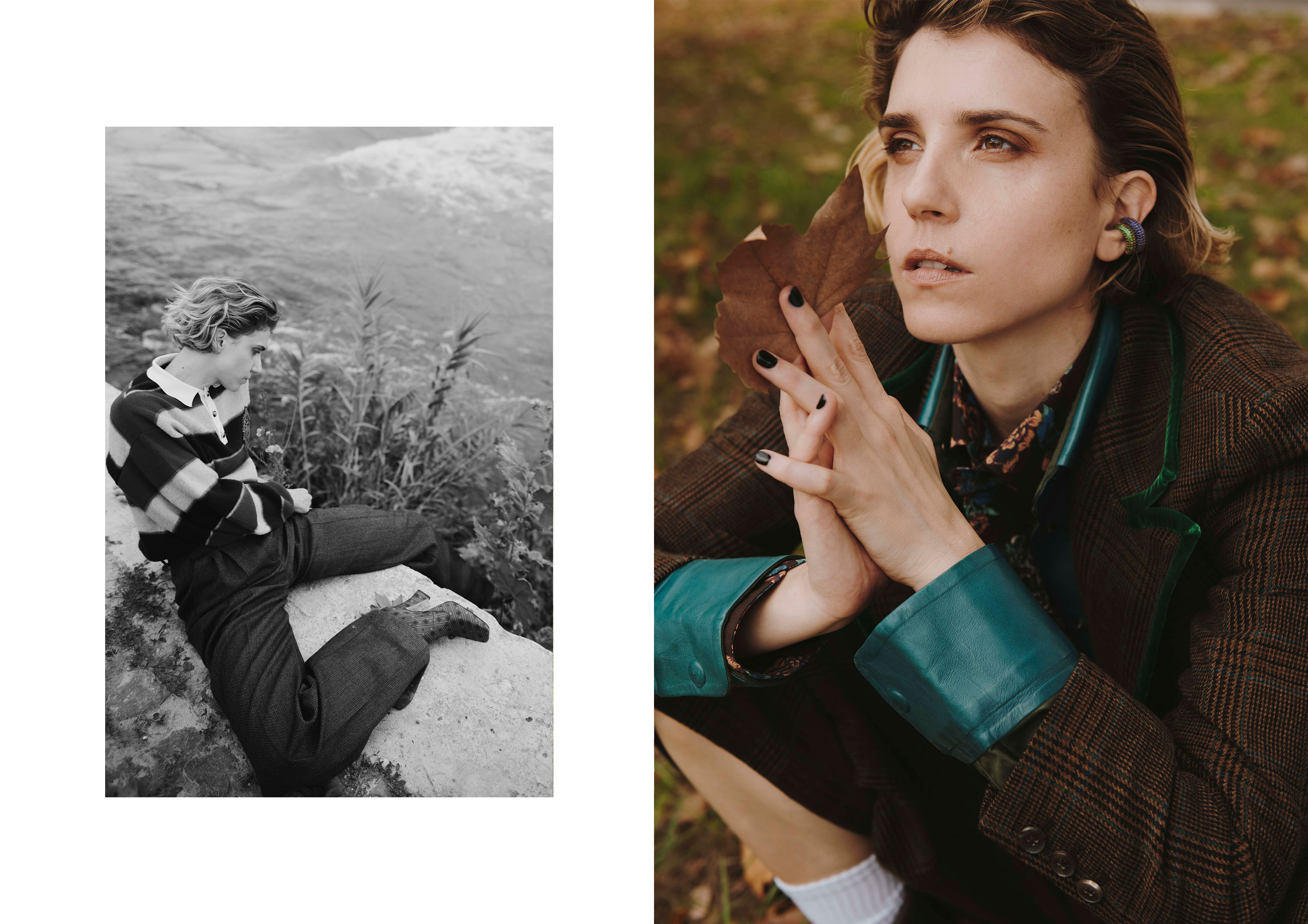 coat Twins Florence, blazer & trousers & belt & shirt Etro, leather shirt Salvatore Ferragamo, boots Stella McCartney, earrings Fendi
